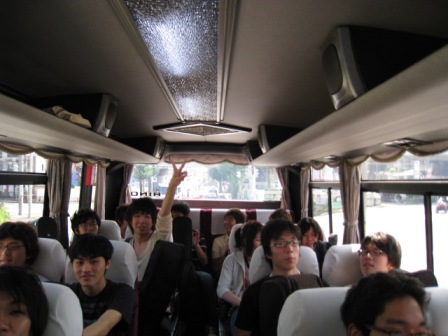 集合は8時50分。まあここはFLAだったとだけ言っておきましょう。それでみんなわかるはずです。そんないつも通りな幕開け♪天候は晴れ♪結局は無事にバスに乗り込み出発しました。バスの大きさはちょうどよかったかな。ギターで少し定員オーバー気味だった気もしますが、なにせ相棒は大事です。というか、ほとんどの人が自分のギターをすでに持っていました。すばらしい。個人的に買っていたんやね。部室のギター達はお留守番です。