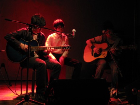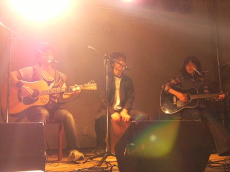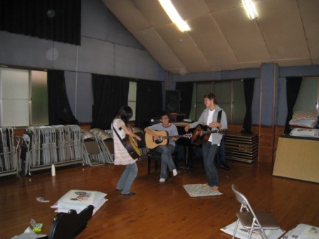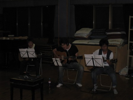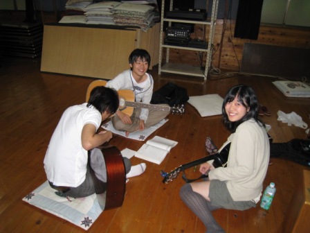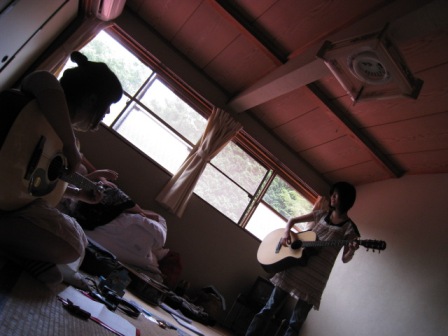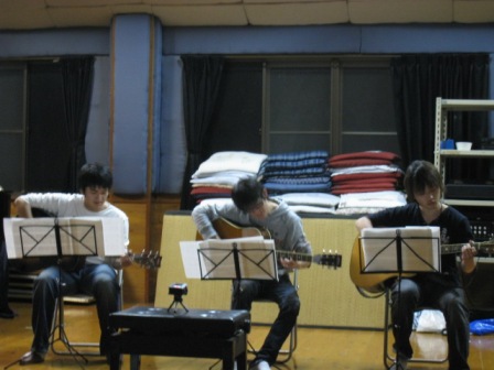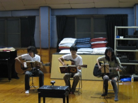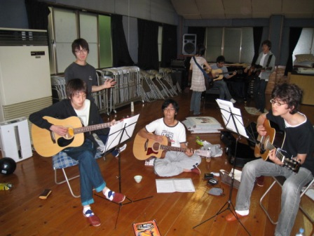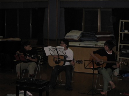弾けない弾けない言ってたのに弾ける人はいるし、上達ぶり半端ない人はいるし、ボトルネックでアレンジする人はいるし、って感じのグループでした。誰かわかるかな。写真の右、左、中央って感じ。なほか、弾けるんだから部室でもひこうよー。ひとみは、俺以上うまくならないでね。豪ちゃん、お疲れさん。