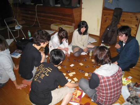 ごちそうさまの後は各自集まって、ダランダランやって、ジャカジャカやって、トランプやって、風呂入って、お酒飲んで、眠たきゃ寝て、夜は更けて行きました。二日目のことなど気にも留めずに…だったかな?